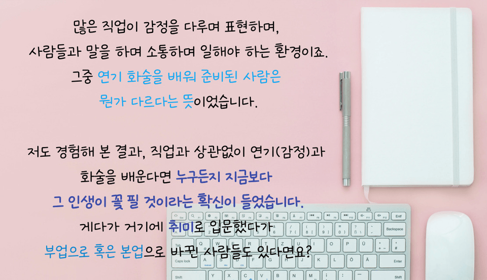 직업과 상관없이 연기(감정)과 화술을 배운다면 지금보다 인생이 꽃 필 것입니다.