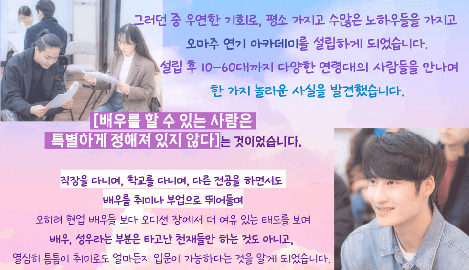 그러던 중 우연한 기회로, 평소 가지고 수많은 노하우들을 가지고 연기 아카데미를 설립하게 되었습니다.