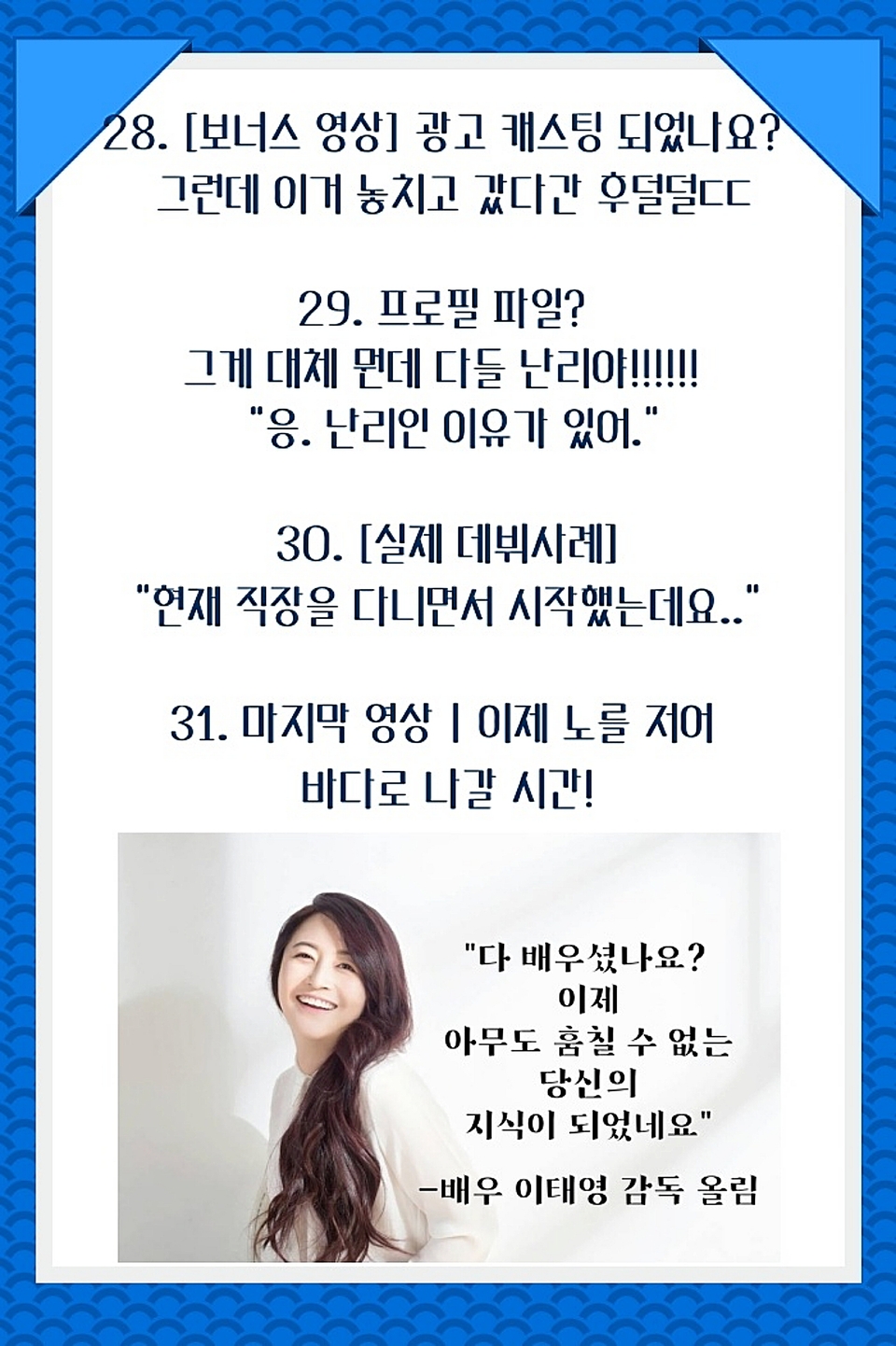 공부하는 것 같이 지루 한 느낌이 들지않고 진짜 신선하고 재미있어요~♡ 연기를 부업으로 부수입 벌고있는 사람들이 생각보다 많아 놀랐네요~ 데뷔 방법이랑 오디션 방법까지 현직 배우님 감독님이 알려주니 더 생생해요! 전 배우가 될건 아니지만 확실히 이 수업은 제 직장생활에도 도움 될 것 같아요~ 제 평소 모습에서 고칠게 참 많네요 ㅋㅋㅋㅋㅋ 연기수업 되게 재밌어요~ 주변에도 추천 많이 할거에요~~^^