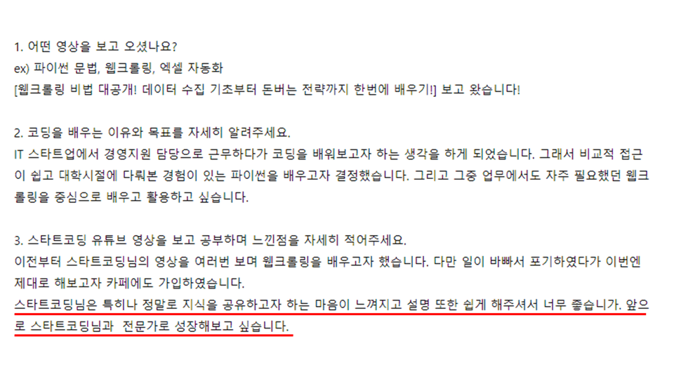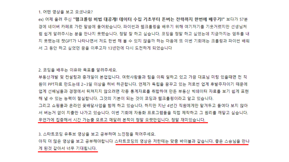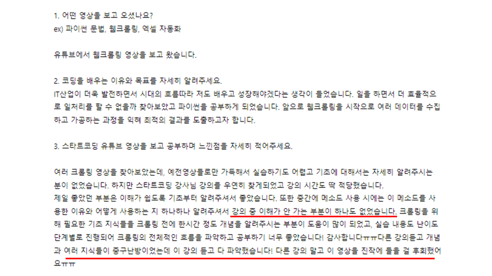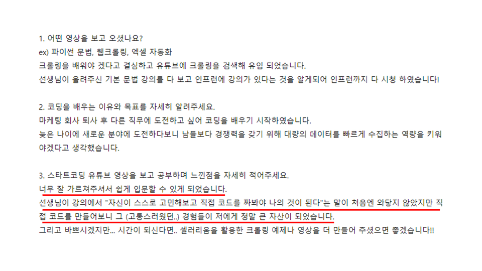 Hello, Park Hyo-jeong~!! This is Start Coding. If you learn crawling well, you can save time and reduce human errors with automation programs, and even earn extra income through outsourcing or education :)