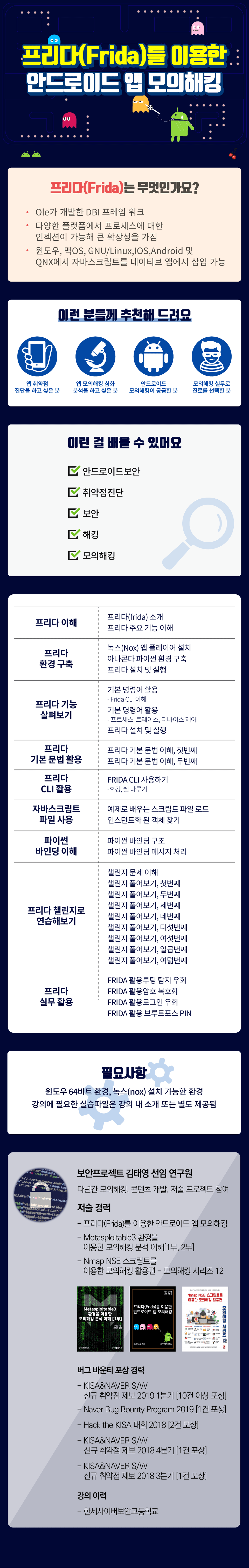 모의해킹 실무에서 활용되고 있는 프리다 (Frida)의 완벽 활용법을 배울 수 있습니다.
