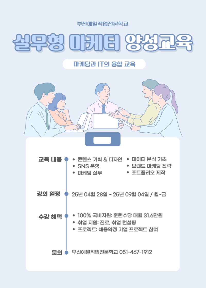 콘텐츠 기획, SNS 운영, 광고 실습 등 디지털 마케팅 전반을 실무 중심으로 학습합니다. 디자인 툴 활용과 포트폴리오 제작까지 병행해 마케팅과 IT 융합 역량을 강화하는 과정입니다.