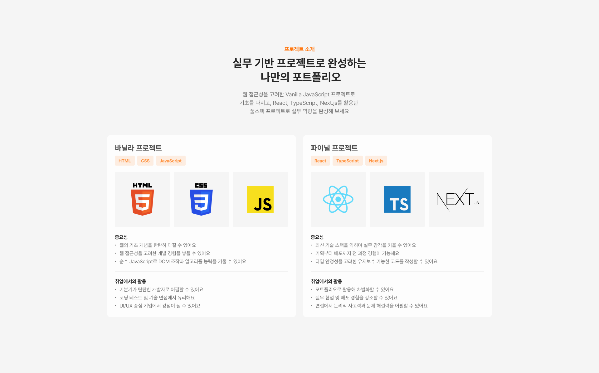 라이브러리 없이 오직 HTML, CSS, JavaScript만으로 웹사이트를 직접 만들어보는 과정! 기초를 탄탄하게 다지면서, 프론트엔드의 핵심 개념을 몸으로 습득할 수 있어요.
