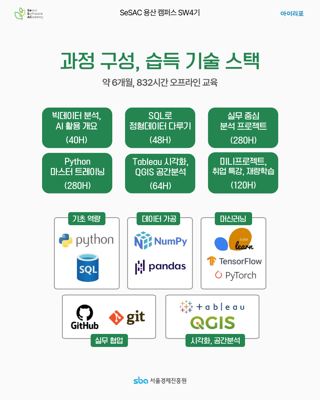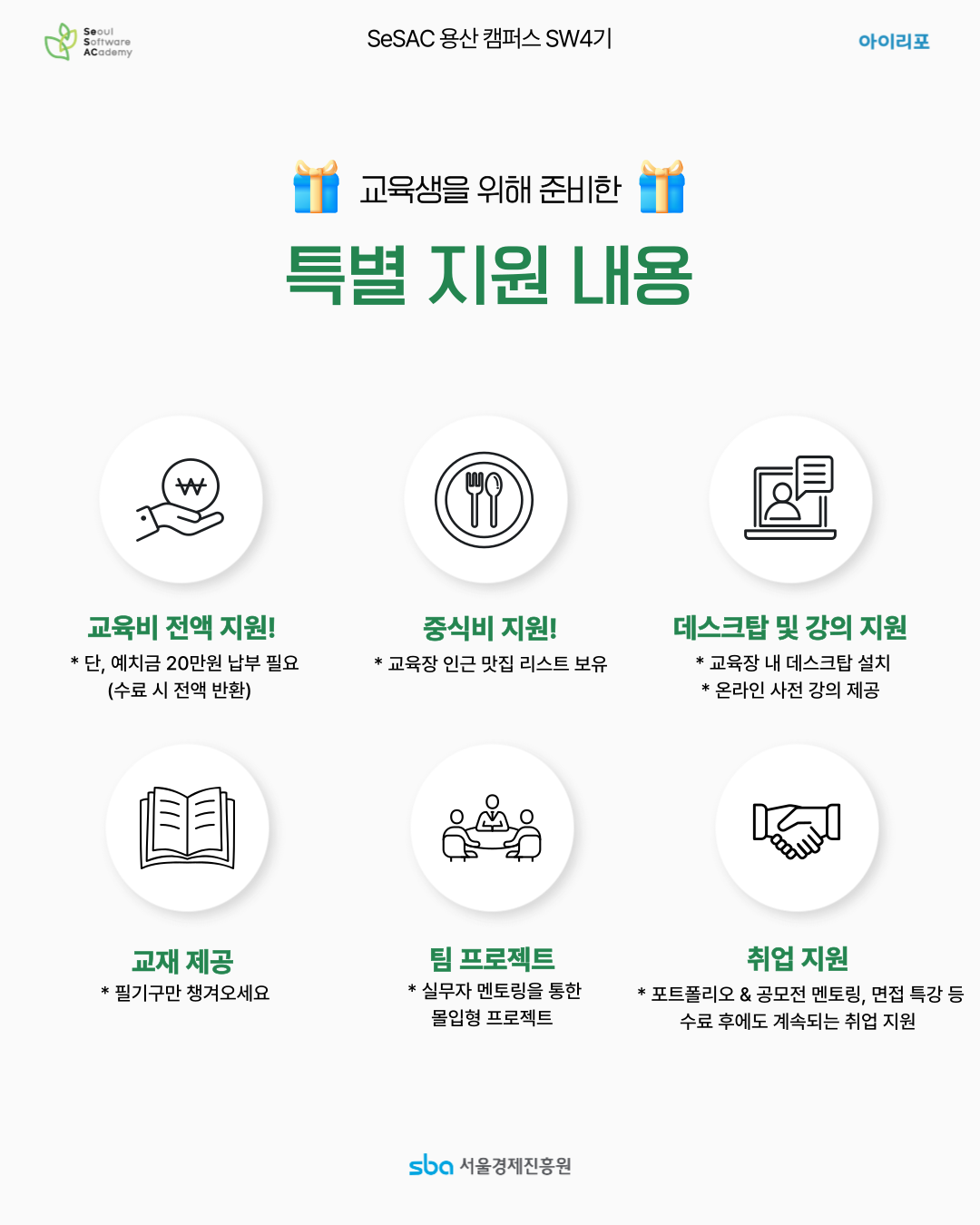 서울시와 서울경제진흥원(SBA)가 디지털 미래 인재를 양성하기 위해 조성/운영하고 있는 청년취업사관학교 새싹(SeSAC) 용산캠퍼스에서 4기 교육생을 모집합니다.