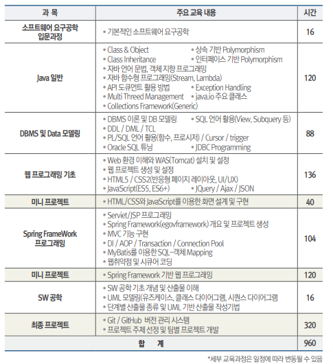 • 소프트웨어 요구공학 입문과정,Java 일반. 웹프로그래밍 기초, DBMS 및 DB 모델링, Spring FrameWork 프로그래밍, 실무프로젝트 등으로 이루어져있습니다