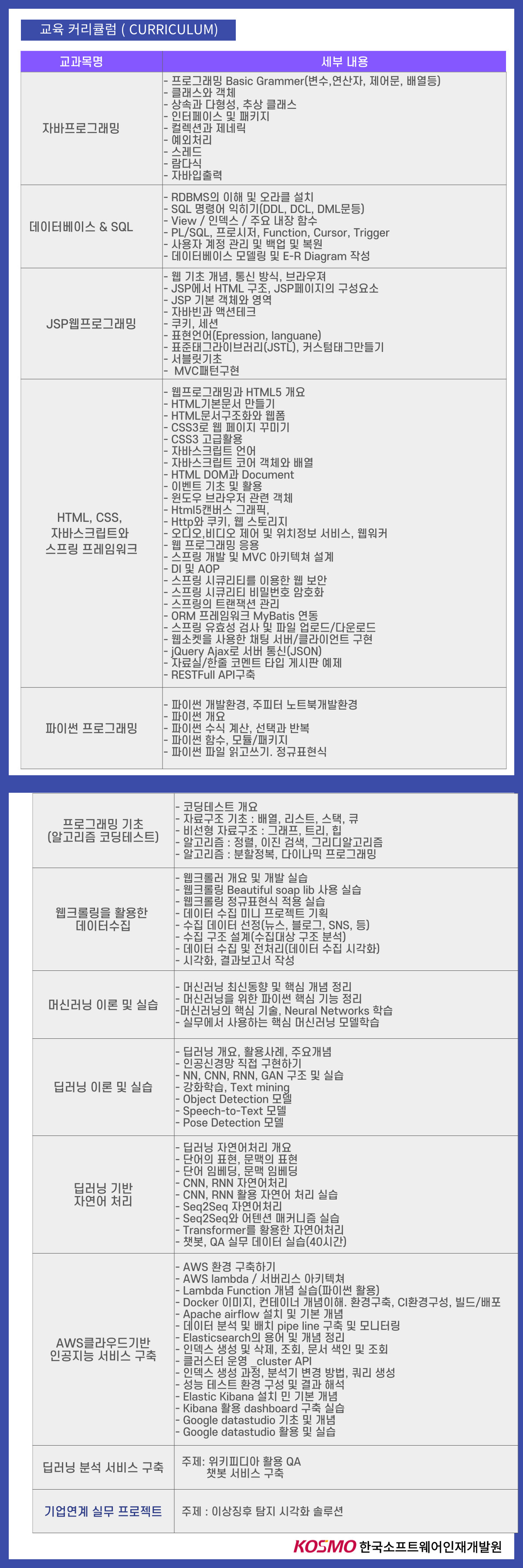과정명 : 빅데이터 서비스 구현을 위한 자바 파이썬 (Java, Python) 개발자 과정