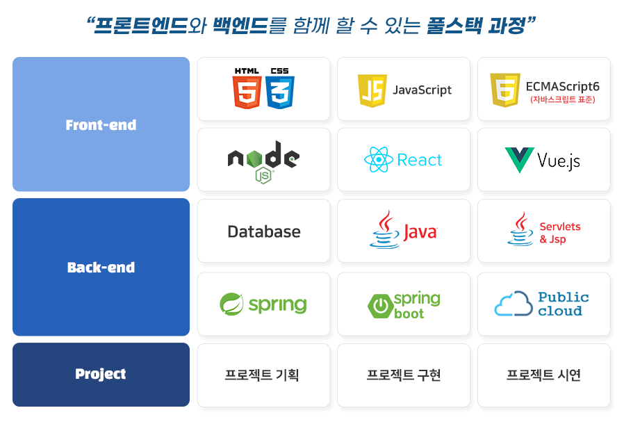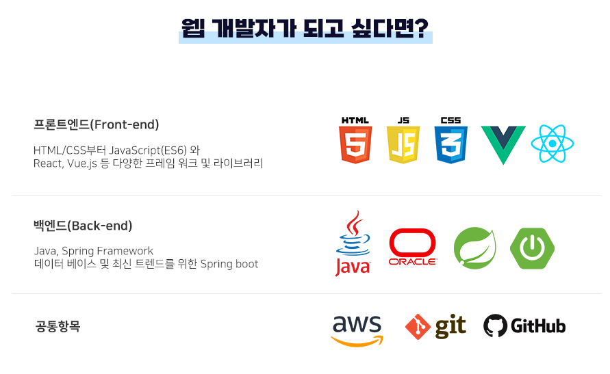 프론트엔드 : HTML과 CSS를 시작으로 프론트엔드의 필수 언어인 JavaScript를 배우게 됩니다.