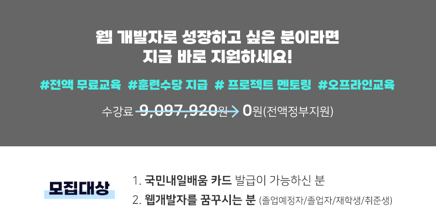 비전공자 취업률 80%로 컴퓨터 지식과 코딩 경험이 없는 분들도 신입 개발자의 역량을 기르고 취업 연계 및 지원을 받을 수 있는 강의입니다.