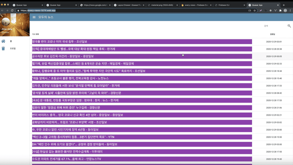 Quasar framework (vue.js) 와 구글뉴스 rss를 이용한 뉴스 사이트를 만들고, firebase hosting을 통해 배포해봅니다.