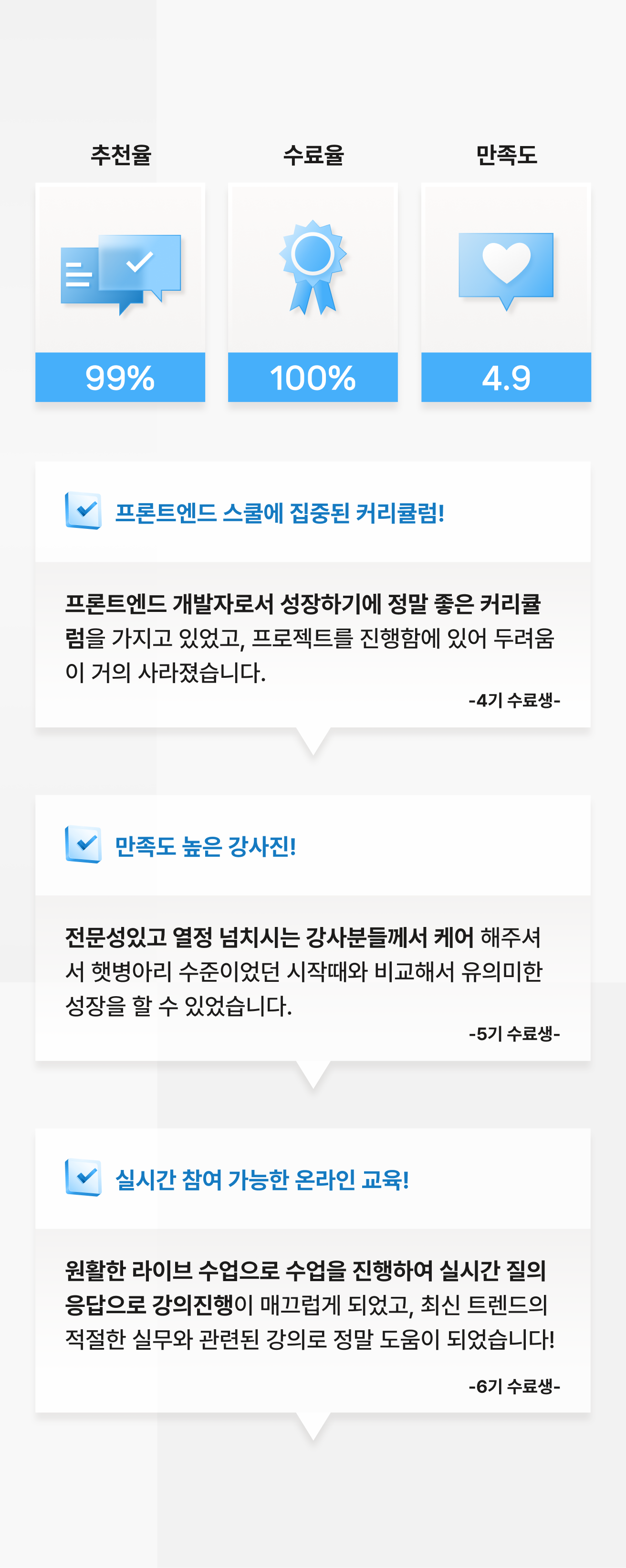 - 프론트엔드에 몰입할 수 있는 3단계 커리큘럼과 전문 강사진