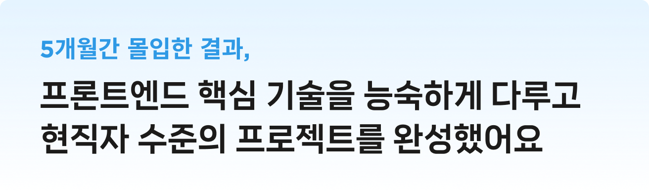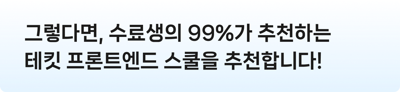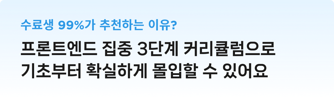 프론트엔드에 온전히 몰입할 수 있는 3단계 집중 커리큘럼과 수강생 맞춤형 운영 노하우로 수료생 99%가 적극 추천하는 프론트엔드 스쿨과 함께 해요!