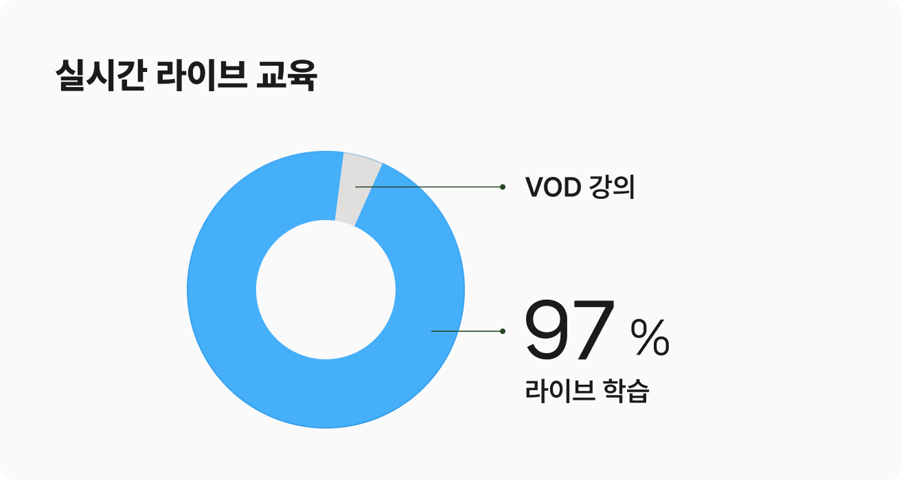 - 집에서도 오프라인처럼 적극적으로 참여하실 수 있도록 전체 학습 일정의 97%가 실시간 라이브 학습으로 진행돼요.