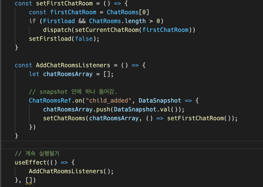 빈 배열에 chatRooms state값을 넣어서 바뀔때마다 실행되게 해야하나 했더니 chatRoomsRef.on 속성때문에 계속 on 되어서 그런지 계속 무한 루프가 걸려서 과부하가 걸리더라고요..; 그렇게해서 저렇게 빈 속성을 넣게되면은 또 하나의 채팅방만 보이게됩니다 ㅠㅠ , 함수형으로 구현했을때 useEffect에 대해서 어떻게 사용해야 할지 감이 안오네요