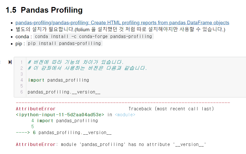일부 판다스프로파일링에서 __version__ 을 출력하려고 할 때 문의주신 것처럼 버전 표기가 안 되는 문제가 발생하는 질문을 여러 번 받았어요.