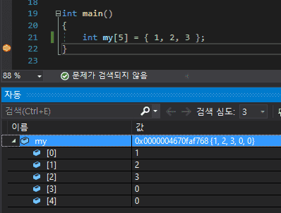 int my[5] = { 1, 2, 3 }; 이렇게 일부만 하면 앞에 3개의 원소만 초기화 되고 나머지는 0 으로 초기화 되는 듯 합니다.