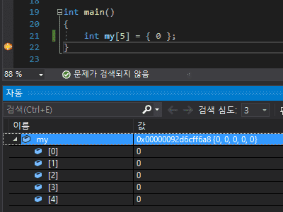이렇게 int my[5] = { 0 }; 으로 하시면 됩니다. 첫 번째 원소가 0 으로 초기화 되고 그 나머지 원소들도 0 으로 초기화가 된 모습입니다.