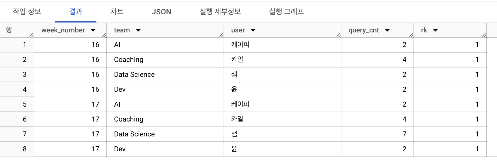 주차별로 팀 내에 쿼리를 많이 실행한 수를 구한 후, 실행한 수를 활용해 랭킹을 구해주세요.