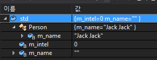 Student 에도 m_name 멤버를 정의해주셨기 때문에 std객체 안에는 Person으로부터 받은 m_name, 그리고 본인만의 m_name 이렇게 동명의 m_name 부분을 다른 종류로 2개나 가지고 있는 셈이 됩니다.