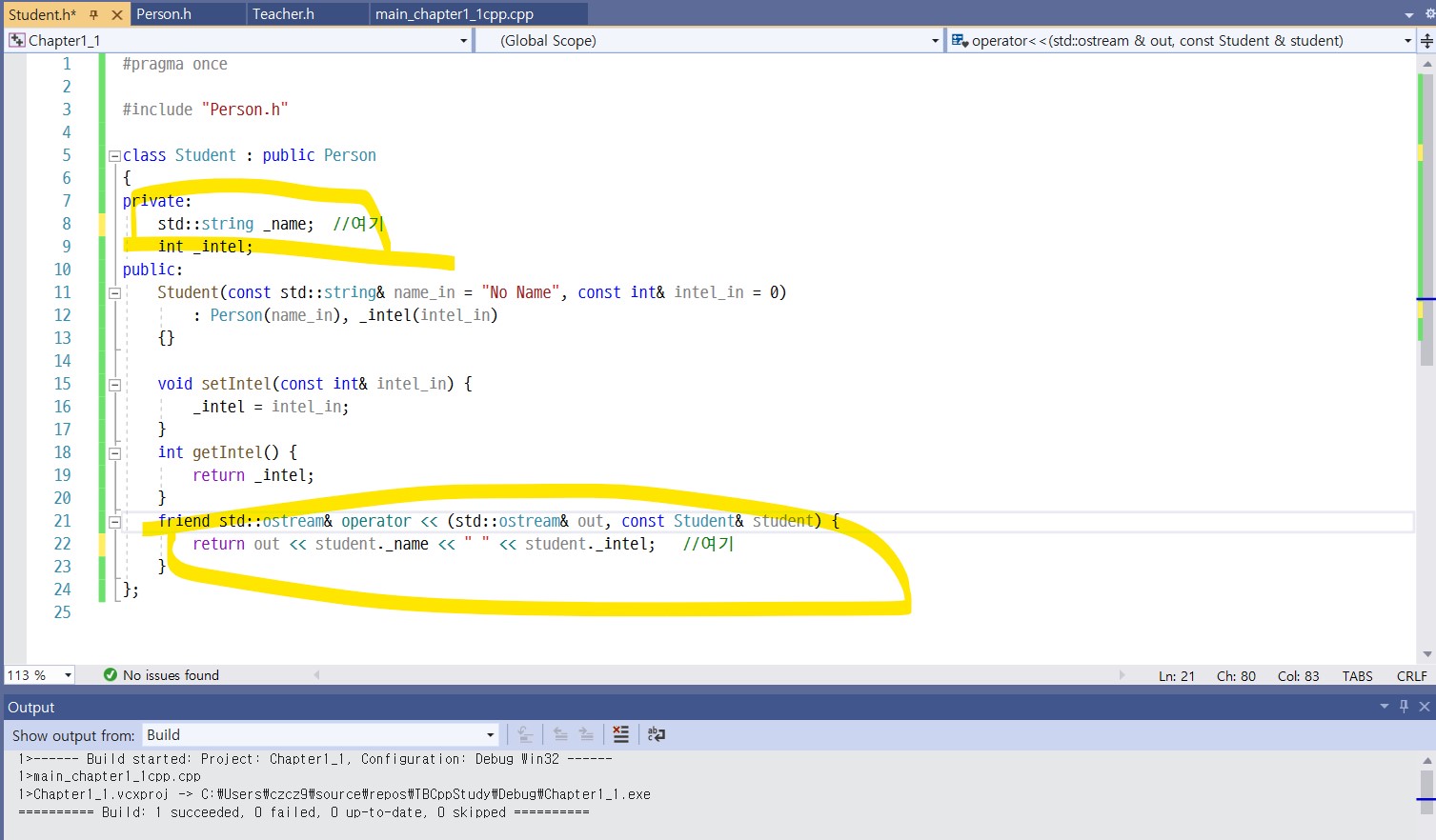 setName은 Person 으로부터 상속받은 멤버함수이기 때문에 setName은 위 사진에서 확인할 수 있듯이 Person으로부터 물려받은 m_name 값을 설정하게 됩니다. 마찬가지로 Student 생성자 보시면 아시겠지만 생성자로 이름 세팅하는 것도 Person 생성자를 호출해서 하고 있으니 이 과정도 Person으로부터 물려받은 m_name 값을 세팅하는 것입니다.