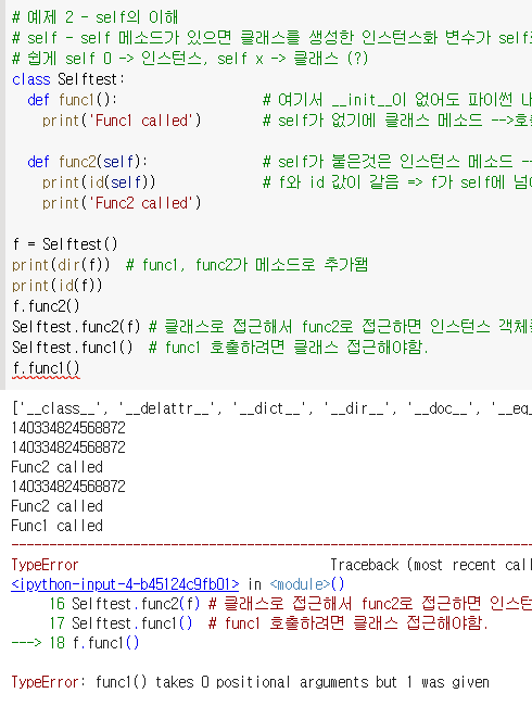 f.func1() 의 코딩이 오류가 나는데, 원래 클래스 메소드는 클래스가 전체 공유하는 거잖아요?, f도 Selftest 클래스에 속해있는데 왜 func1() 함수를 사용 못하는 건가요?