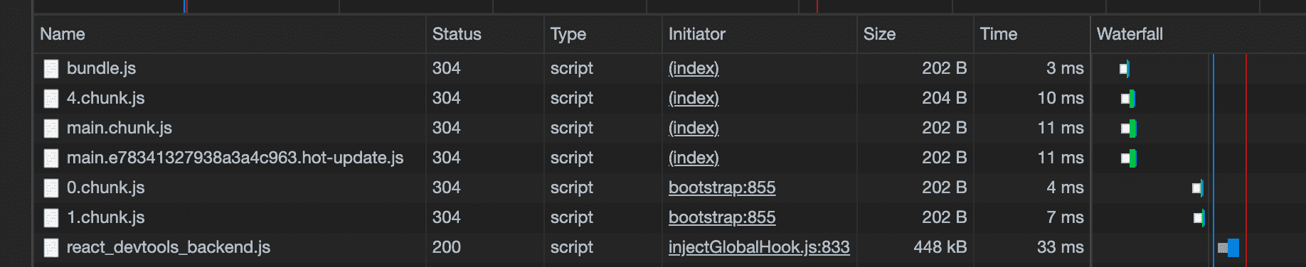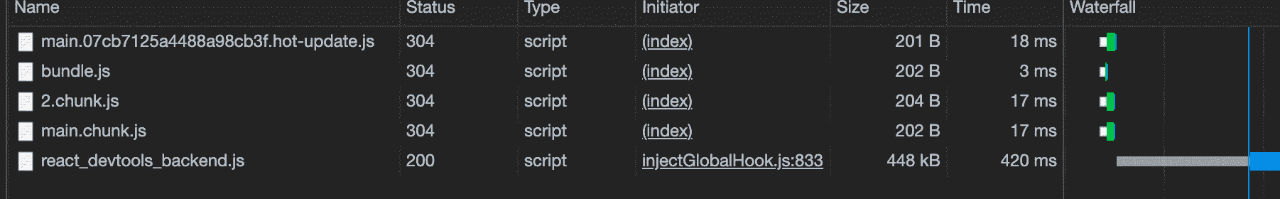 상태 코드를 보시면(Status) 304로 찍혀있는게 보이는데요, 304는 Not Modified의 의미(https://developer.mozilla.org/ko/docs/Web/HTTP/Status/304)로 로컬에 해당 리소스에 대한 캐시가 있고 서버에서 파일이 변경되었는지 확인했을 때, 캐시 리소스와 서버 리소스가 다르지 않다는 의미입니다. (즉, 캐시 리소스가 최신이라는 얘기) (만약 서버에서 코드에 수정사항이 있어서 번들이 바뀌었다면, 로컬의 캐시와 일치하지 않으므로 304 응답이 아닌 변경된 리소스를 정상적으로 전송해줍니다.)