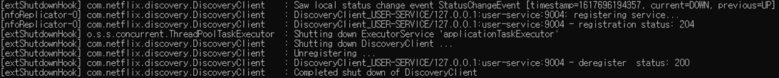 터미널에서 종료시킬 때는 deregister 를 요청해서 200 응답을 받습니다.
