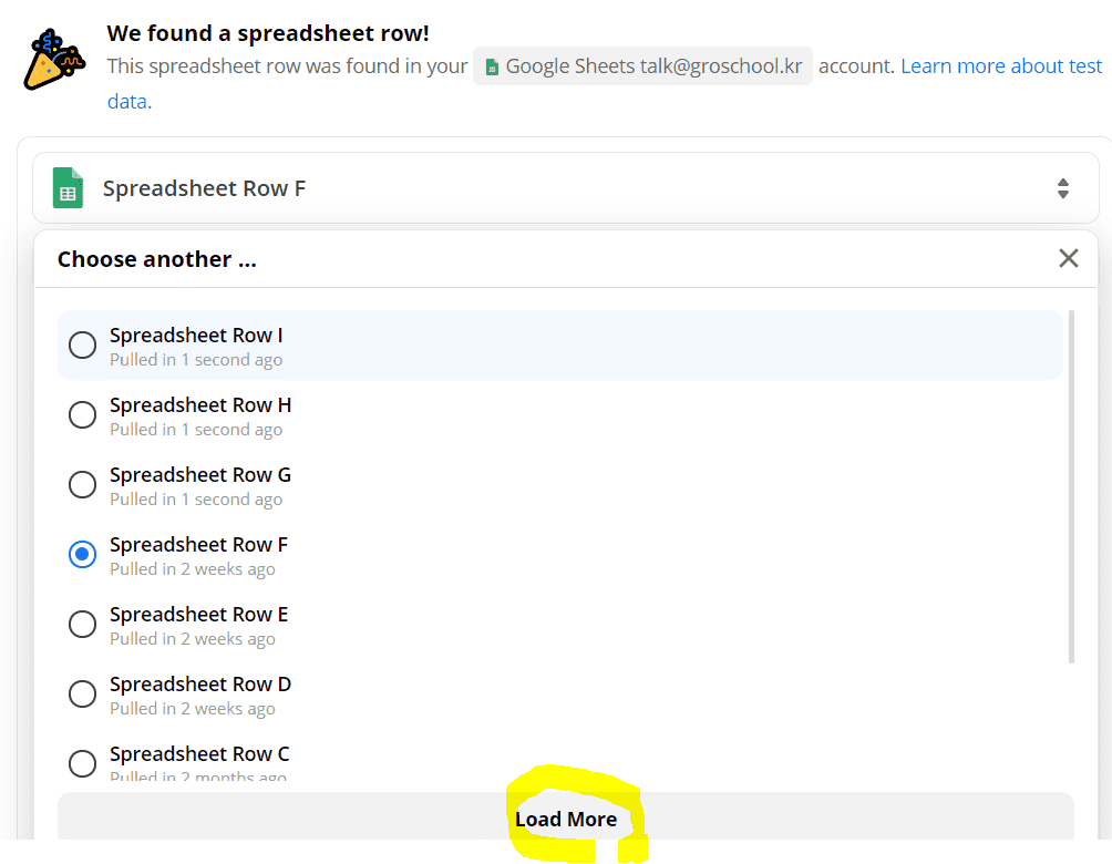그렇다고 테스트를 하지 않으니, 불러오는 값이 없어 구글 행에 입력할 데이터 지정을 못하여서 테스트는 하여야 하는데