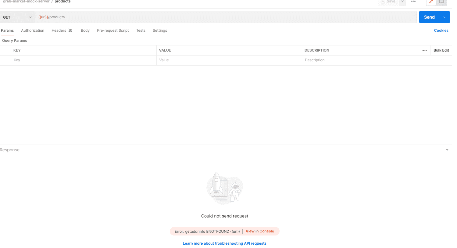 현재 포스트맨 세팅에서 {{url}} 연결에서 오류가 발생하는 것으로 보입니다.