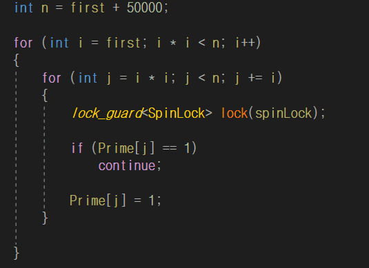 저는 core개수를 미리 파악하는것은 생각못하고 그냥 쓰레드를 20개 만들어서 20개의 쓰레드들이 5만번씩 소수를 구하는 식으로 하려고 했었는데 prime배열과 최종답인 p_cnt는 쓰레드들이 공유하므로 atomic으로 설정해주었고 이 데이터들에 대해 spinlock을 써서 접근하도록 하였습니다.