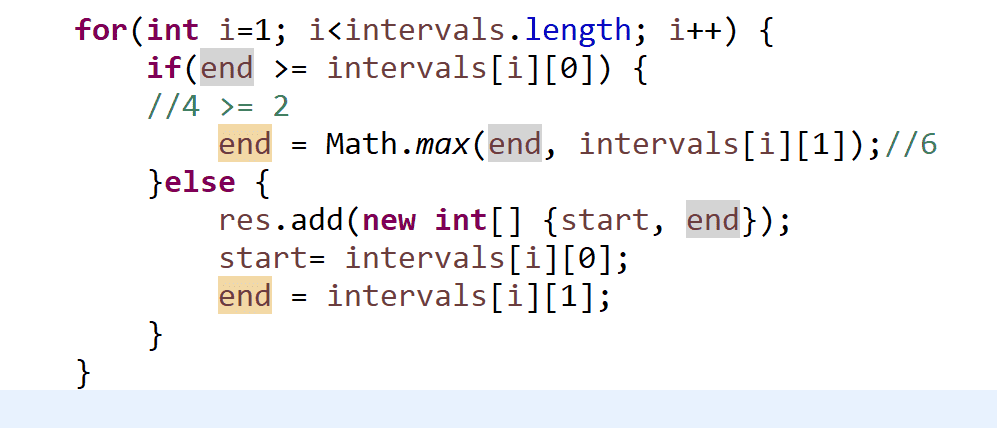 start랑 end를 해놓은게 맨처음 값을 미리 빼놓을려고 선언한 것으로 이해했는데 for문을 돌때 for-each로 돌면 맨처음에 intervals에서 뽑아온 배열은 intervals[0] 이니까 똑같은행동을 2번하게되서 차라리 i=1부터 하는게 좋지 않을까싶어서요..