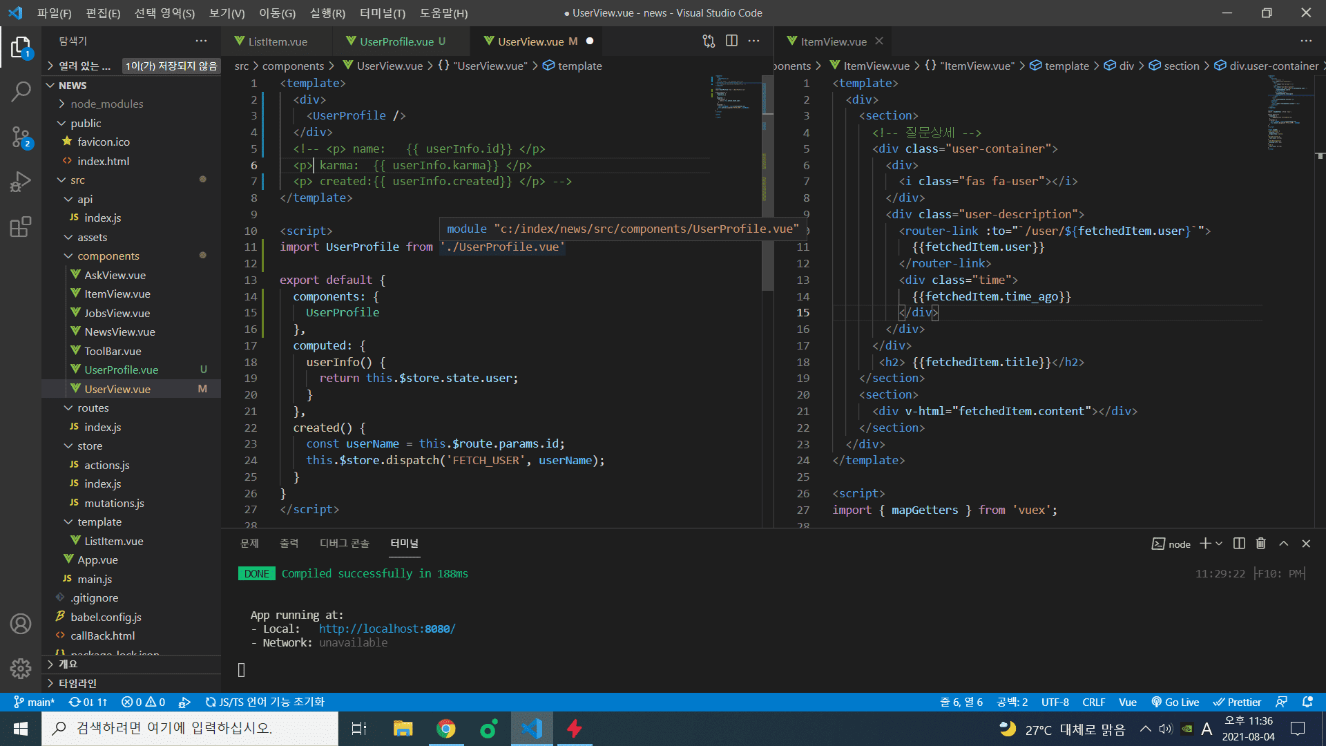 안녕하세요 wjdgksak님, 질문하신게 UserView.vue 컴포넌트가 왜 UserProfile.vue 컴포넌트의 상위 컴포넌트냐고 여쭤보신 건가요? UserView 컴포넌트에서 UserProfile 컴포넌트를 등록해서 상위 컴포넌트가 됩니다 :)