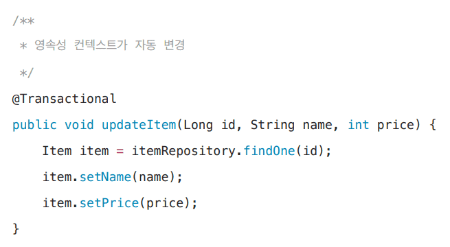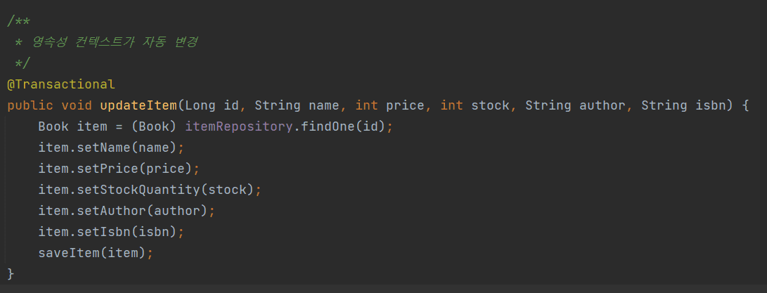 앗 제가 좀 더 공부해보고 다시 보니, findOne으로 조회했기 때문에, 영속성 컨텍스트가 관리 중인 엔티티고, 따라서 'saveItem(item);'와 같은 merge 없이도, 변경 감지 때문에 DB 반영이 잘 이루어지는 것 같습니다.
