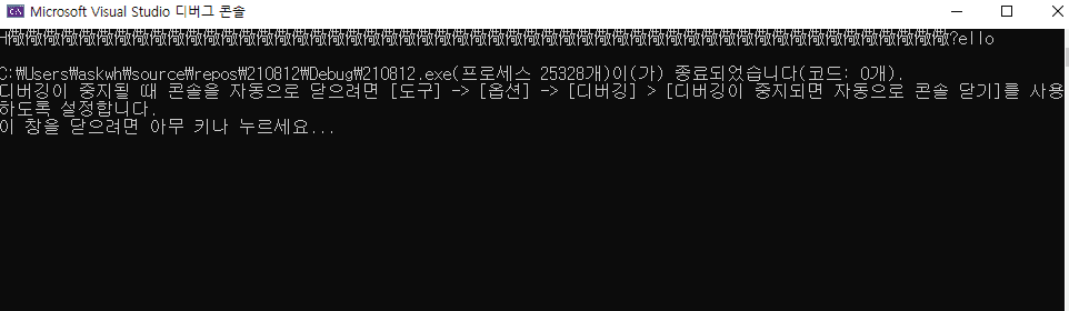 문자열 특성상 NULL을 만날때까지 쭉 출력하게 되어 외계어가 출력되고 있는 것입니다.