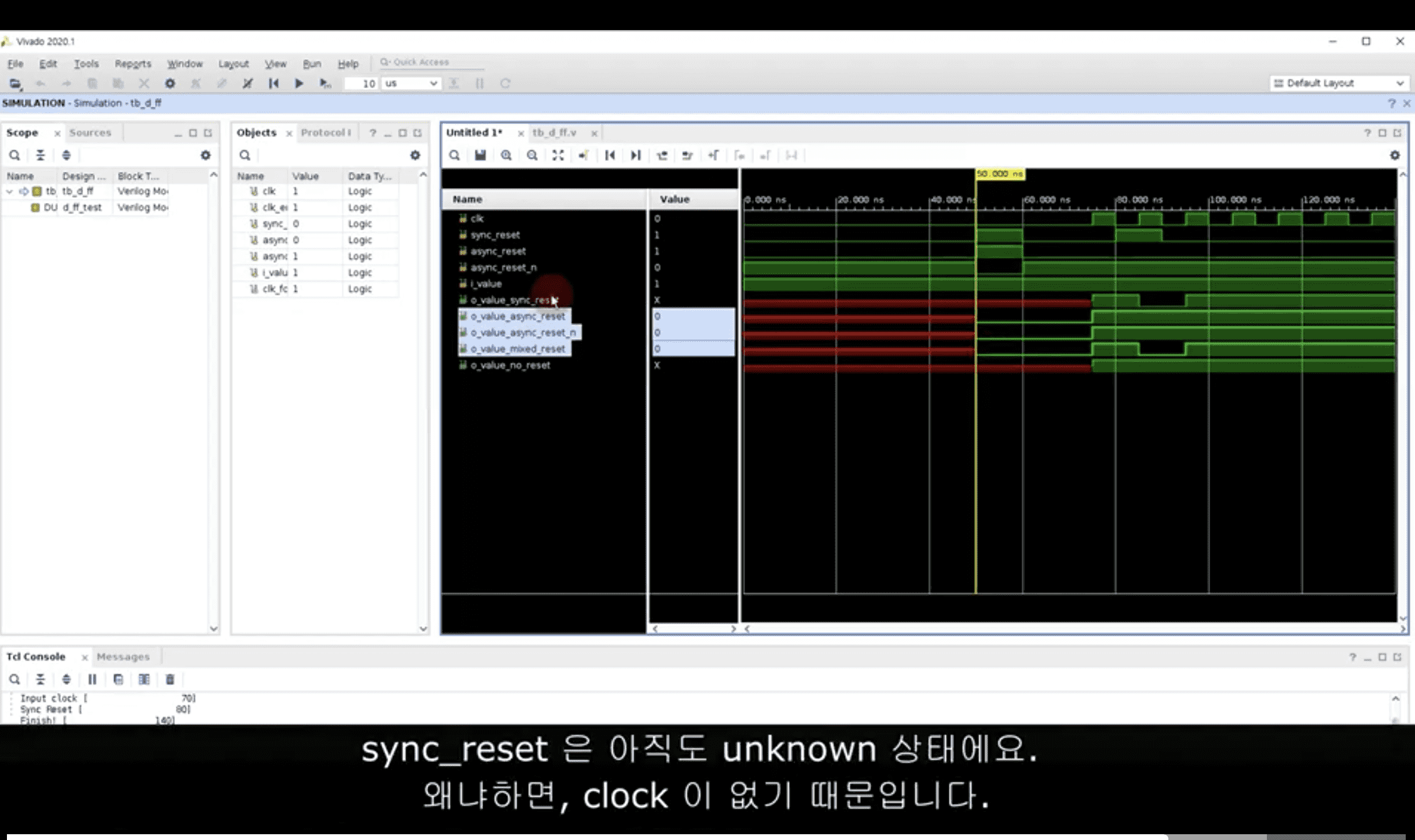 50ns 에서는 sync 와 async, async_n 로 세개에, reset 을 걸었구요. 보시면, clock 이 없기 때문에, async 관련된 d F/F 만 0 으로 초기화 된 것을 확인할 수 있습니다.