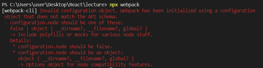 npx webpack 입력 시 다음과 같은 에러가 발생합니다.