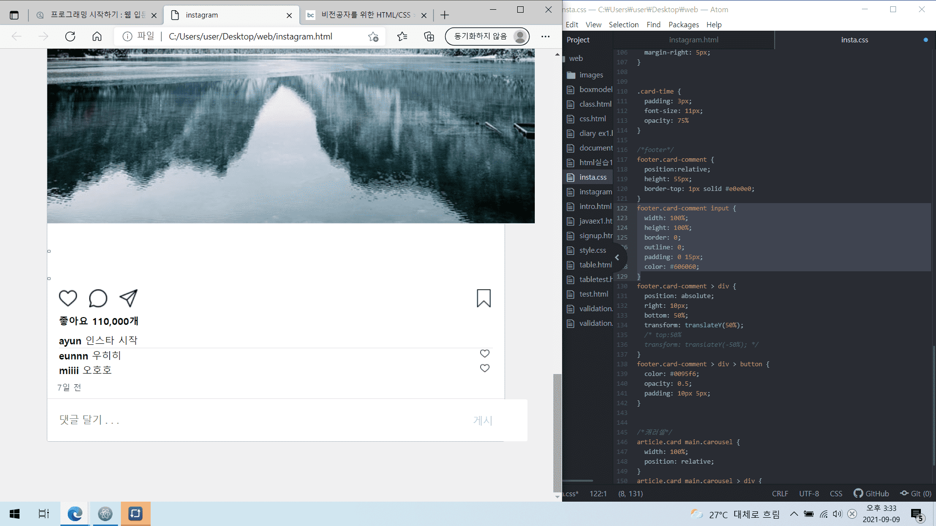 css코드인데요 똑같이 했는데요 댓글달기부분에 패딩값을 설정하면 오른쪽이 자꾸 밖으로 나가요ㅜㅜ 그리고 캐러셀 부분해서 히든을 해도 사진의 오른쪽이 가려지지도 않습니다,,,ㅠㅠ 왜그런 걸까요..?