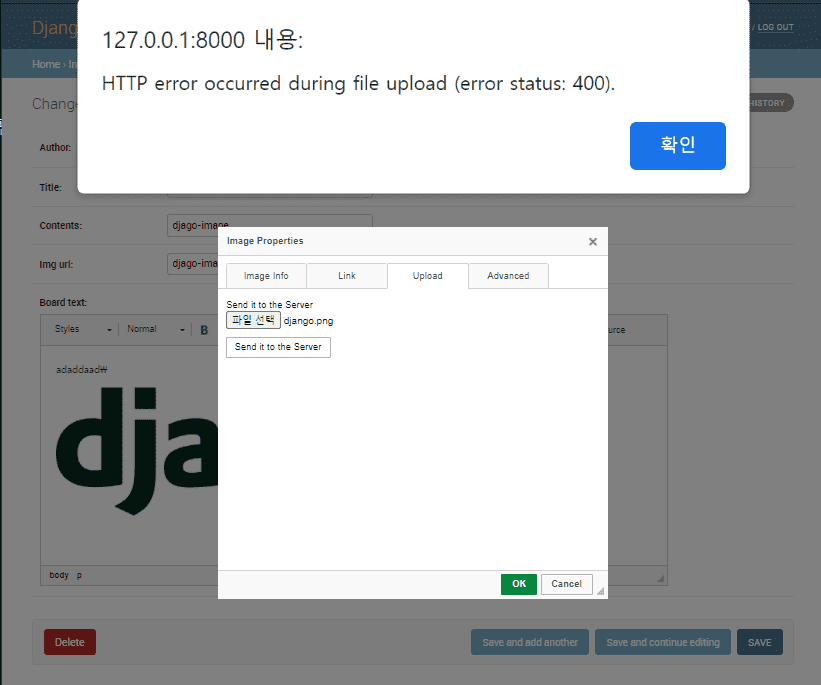 파일선택 후 send it to the server버튼을 누르면 HTTP error occurred during file upload (error status: 400)이라고 오류 팝업이 발생합니다.