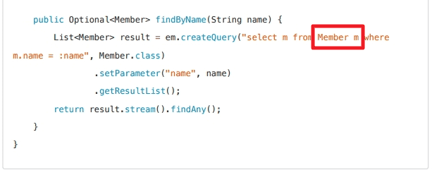 org.hibernate.QueryException: Unable to resolve path [m.name], unexpected token [m] [select m from hello.hellospring.domain.Member where m.name=:name]