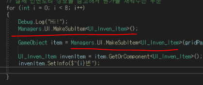 혹시나 두번 도는것인지 보기위해서 UI_Inven.cs의 for문안에 Debug.LOg("HI!")를 찍어봤는데 8번만 찍히구요 왜 그런지 모르겠습니다...