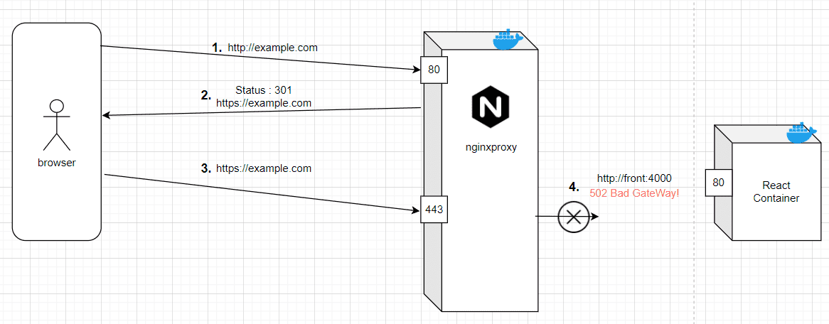 정확하고 꼼꼼하게 제가 볼 수 있을 수는 없는데, 가볍게는 제가 잘 이해했는지 모르겠지만 왜 내부 front 서버에 접속이 안되냐???? 이것 같고, 글쎄요. front:4000 이라면, 해당 front 서버 도커의 내부 설정이 4000번 포트를 내부 포트로 수신받아서 정상적으로 처리할 수 있는지를 먼저 보시는 것도 가볍게 체크해볼만한 포인트가 아닐까 생각합니다.