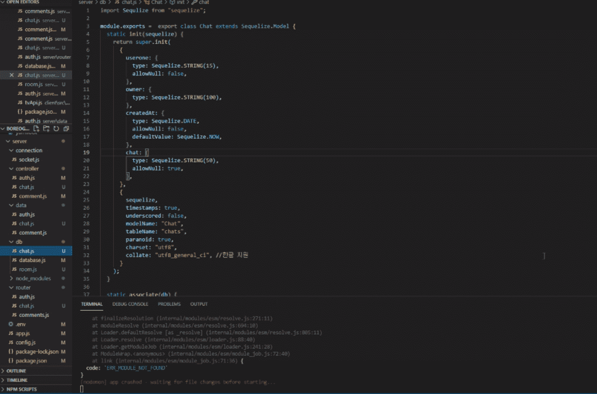 chat.js 모델의 클래스에서 database.js module.exports를 인식하지 못하고 있습니다.