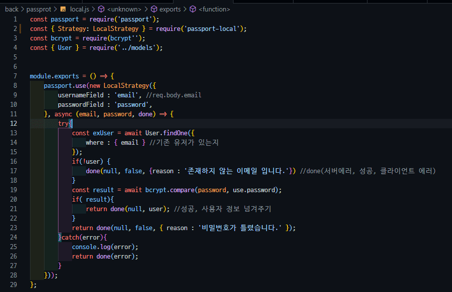 npm i passport passport-local 이렇게 재설치 해도 해당 모듈을 찾을 수 없다고 뜹니다