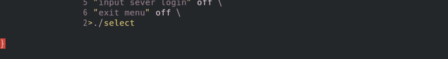 아래 사진과 같이 function menu 함수 마지막 select 파일로 보내는 코드 2>./select 작성 시, 메뉴 함수의 마지막 중괄호가 빨간색으로 변했으나, GUI로 출력은 잘 됐습니다.