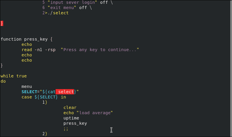 강사님과 마찬가지로 select 파일에 저장된 번호를 SELECT 변수에 담는 코드를 추가하고 난 후에는 변수에 담는 부분이 menu.sh 에서는 빨간색으로 표시되고,