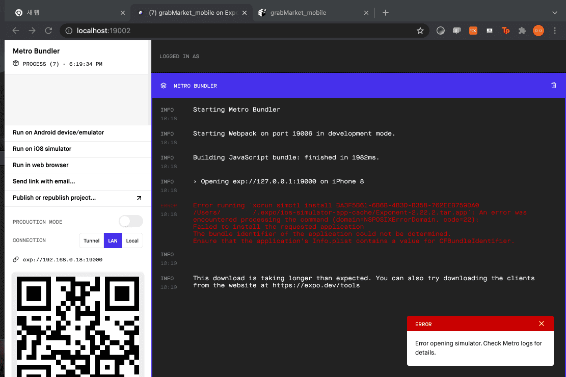 expo에서 run on IOS simulator를 클릭했을때 시뮬레이터가 켜지지 않고 이런 에러창이 뜹니다ㅠㅠ 어떻게 해결해야할까요?