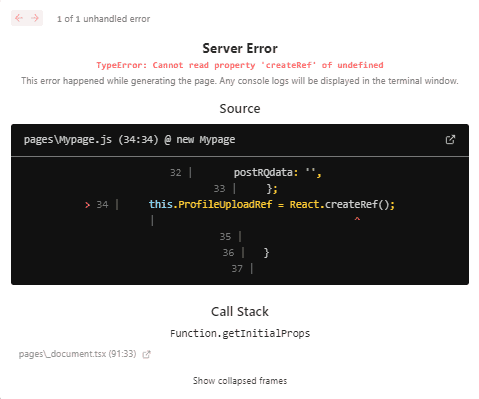 React.createRef 사용중 Next.js가 createRef 인식을 못하는데 뭐가 문제일까요.. ??