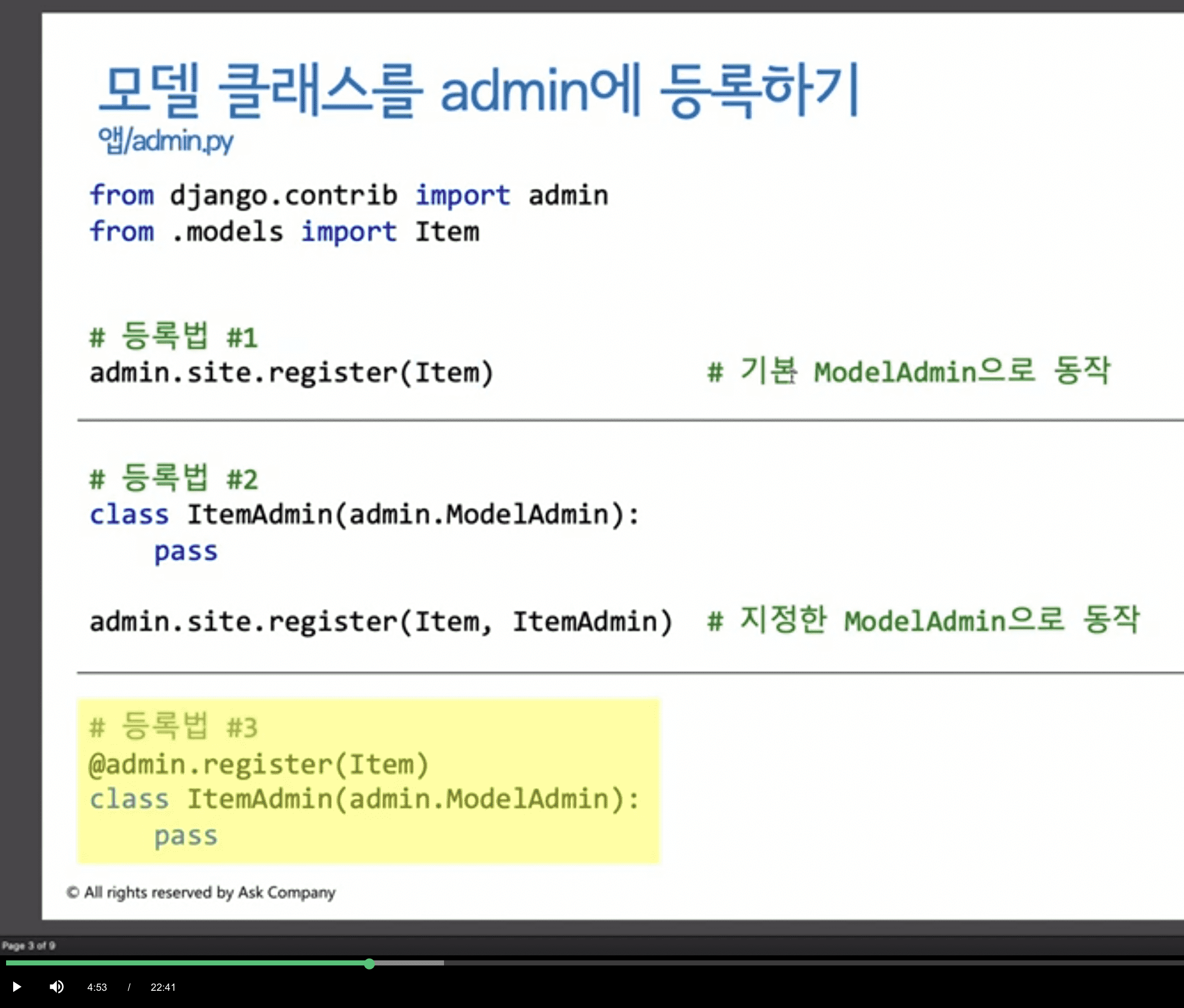아래는 강의 영상 스크린샷이구요. 아래와 같이 모델을 admin에 등록해주셔야 admin 페이지에서 그 모델내역이 뜹니다.