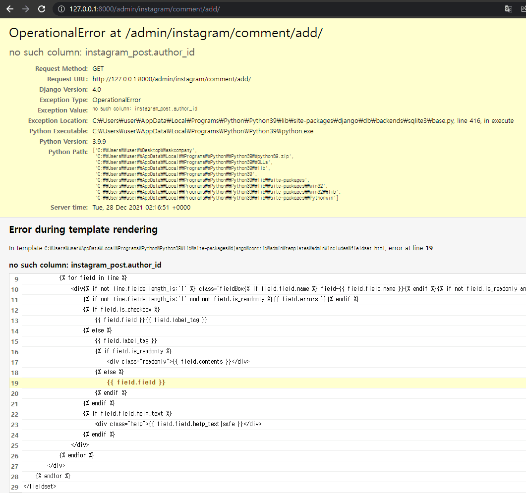 OperationalError 로서 no such column: instagram_post.author_id 와 같은 오류가 발생하는 것은 데이터베이스 오류입니다. 데이터베이스에서는 instagram_post 테이블의 author_id 컬럼이 없다는 오류인데요. instagram_post 테이블의 instagram 앱의 Post 모델을 이야기하며, author_id 컬럼은 author 이름의 필드가 Post 모델에는 정의되어있는 데, 데이터베이스에는 없어서 발생하는 오류입니다.
