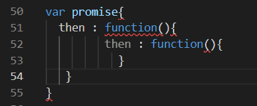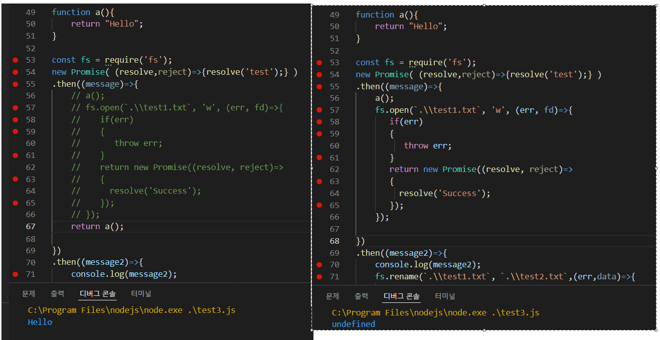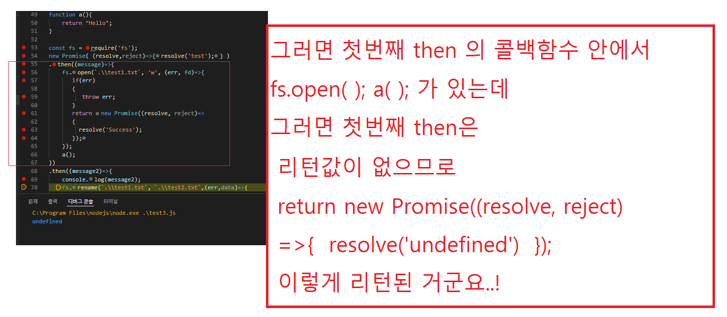 그러나, 우측의 소스코드에서 첫번째 then의 콜백함수 안에는 여러 함수들이 있지만,