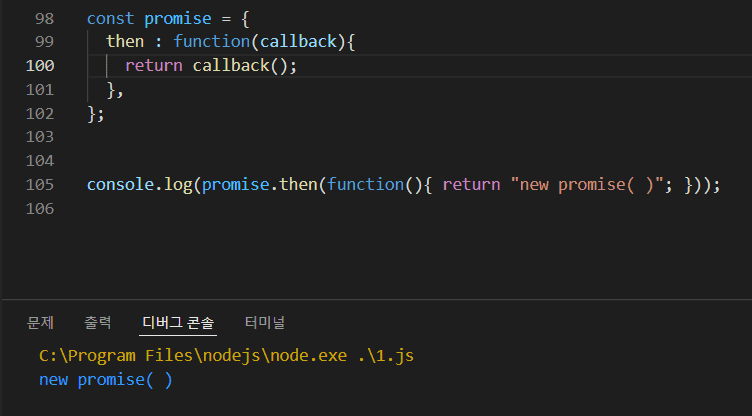 그러면 promise.then의 리턴값을 봐야하는데 이건 특이하게도 안에 넣은 콜백함수의 return값을 리턴값으로 씁니다. 그래서 promise.then()이 통째로 new Promise()가 되는 것이고요. 즉, then 안에 넣은 콜백함수는 코드 상에서는 딱히 호출되거나 하는 게 없습니다. 그냥 그 리턴값을 promise.then한테 제공해주는 역할이에요.